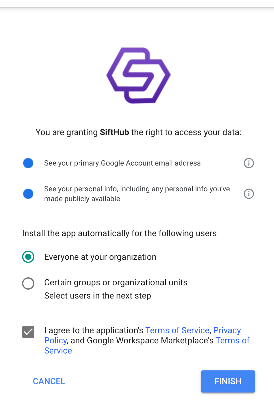 - Google Workspace administrator: Your organization’s Google Workspace settings might require that the workspace administrator allows the SiftHub app to be installed by the users of your org. If such is the case, contact your organization’s Google Workspace administrator.