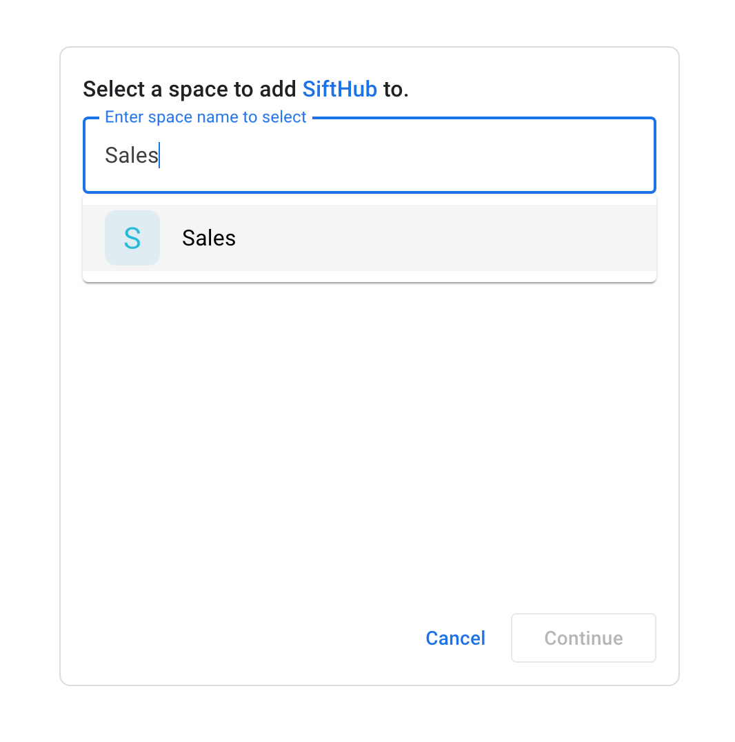 Search for Space you want to add SiftHub to and Continue.
