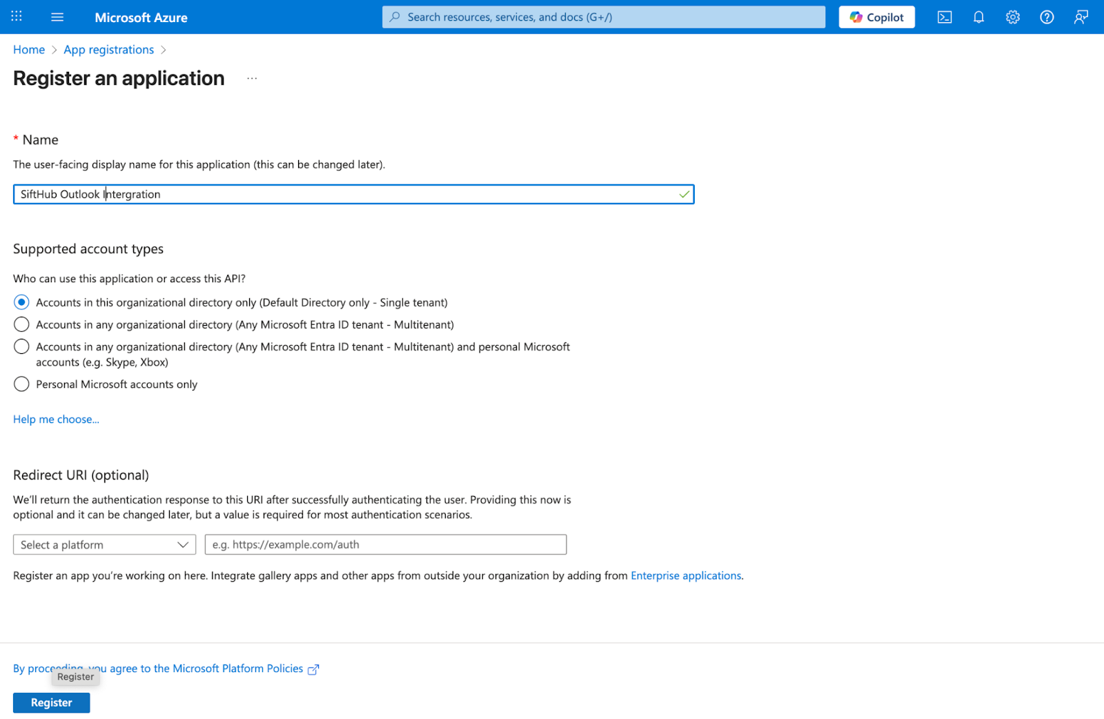 - On the Register an application page, register an app with, Name (eg. SiftHub Calendar Integration), Supported account type( Accounts in this organizational directory only (Single tenant), Redirect URI(Leave it blank).