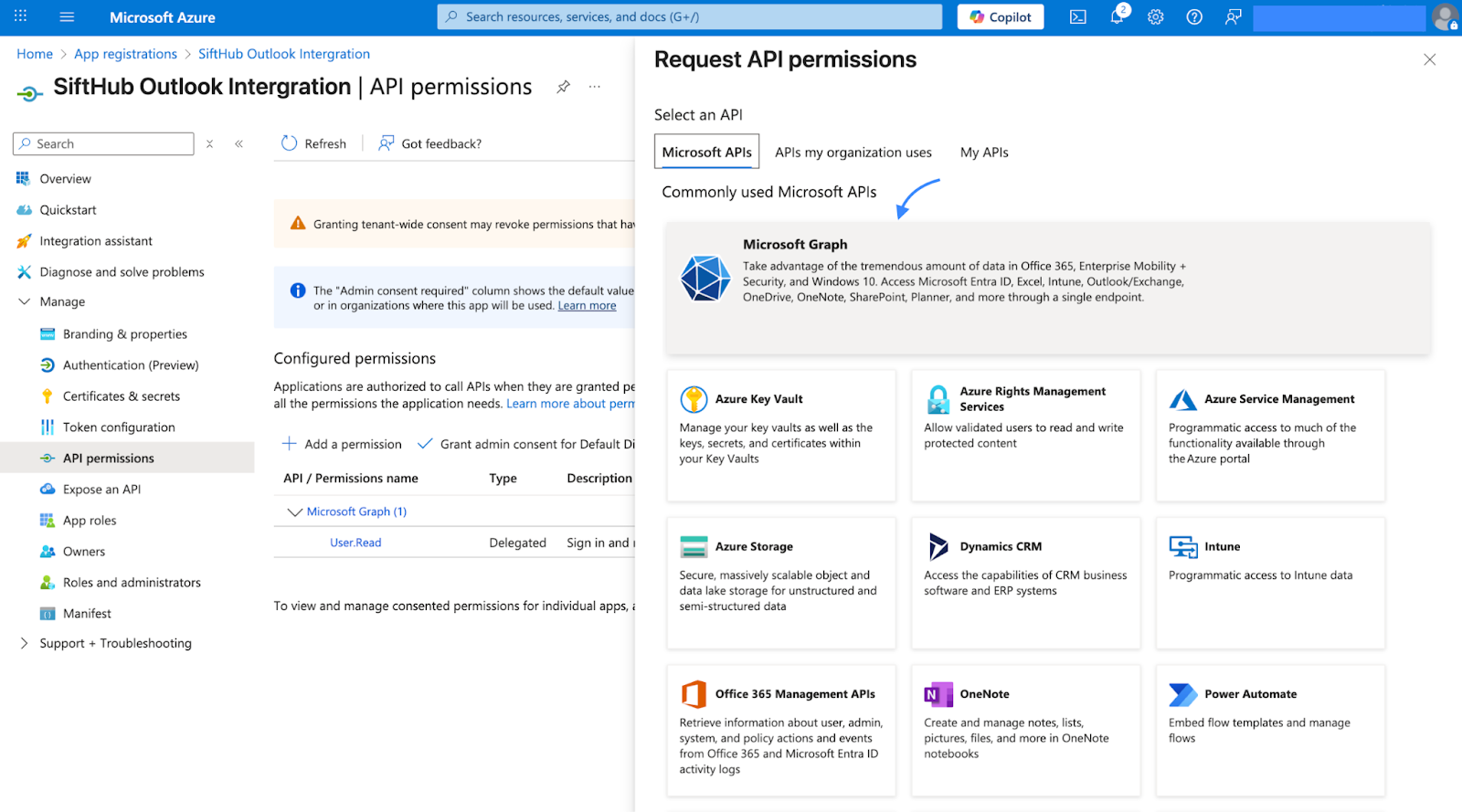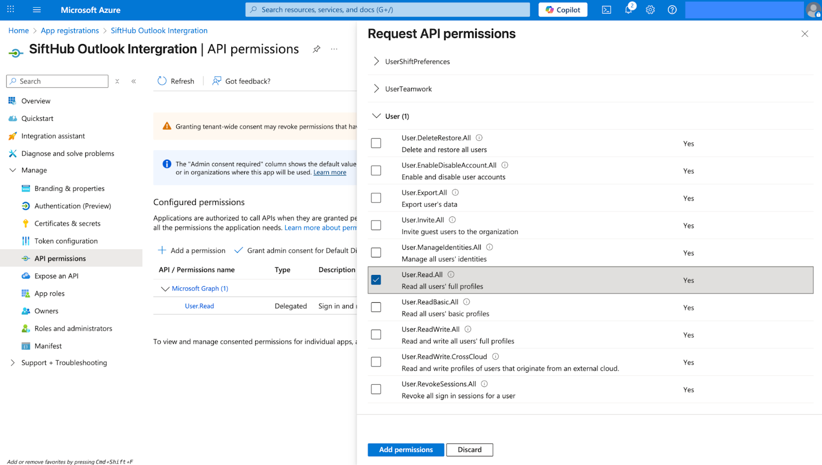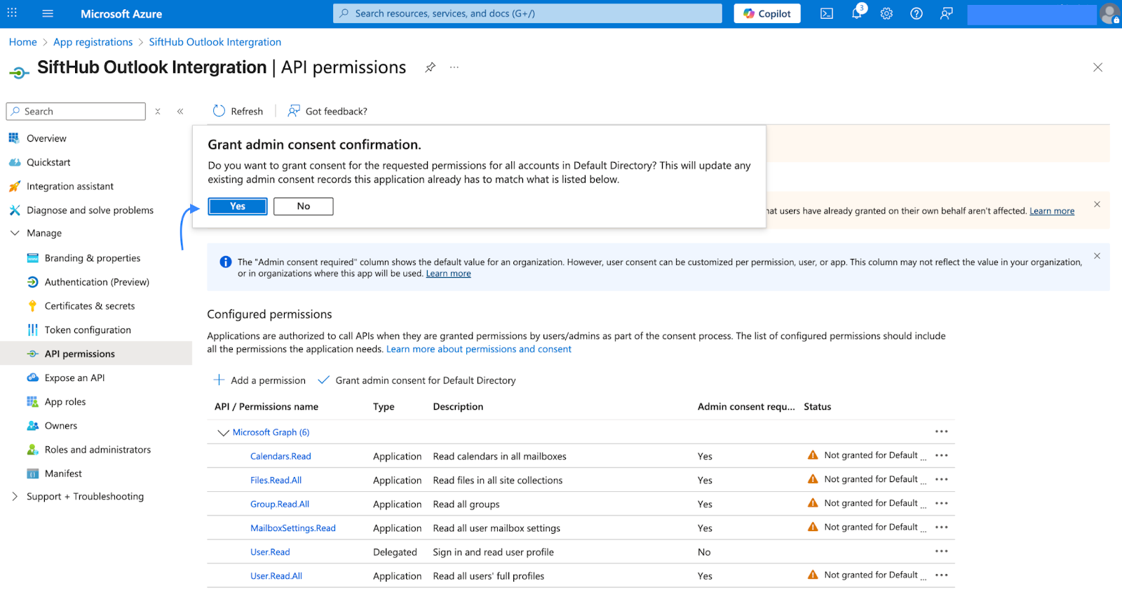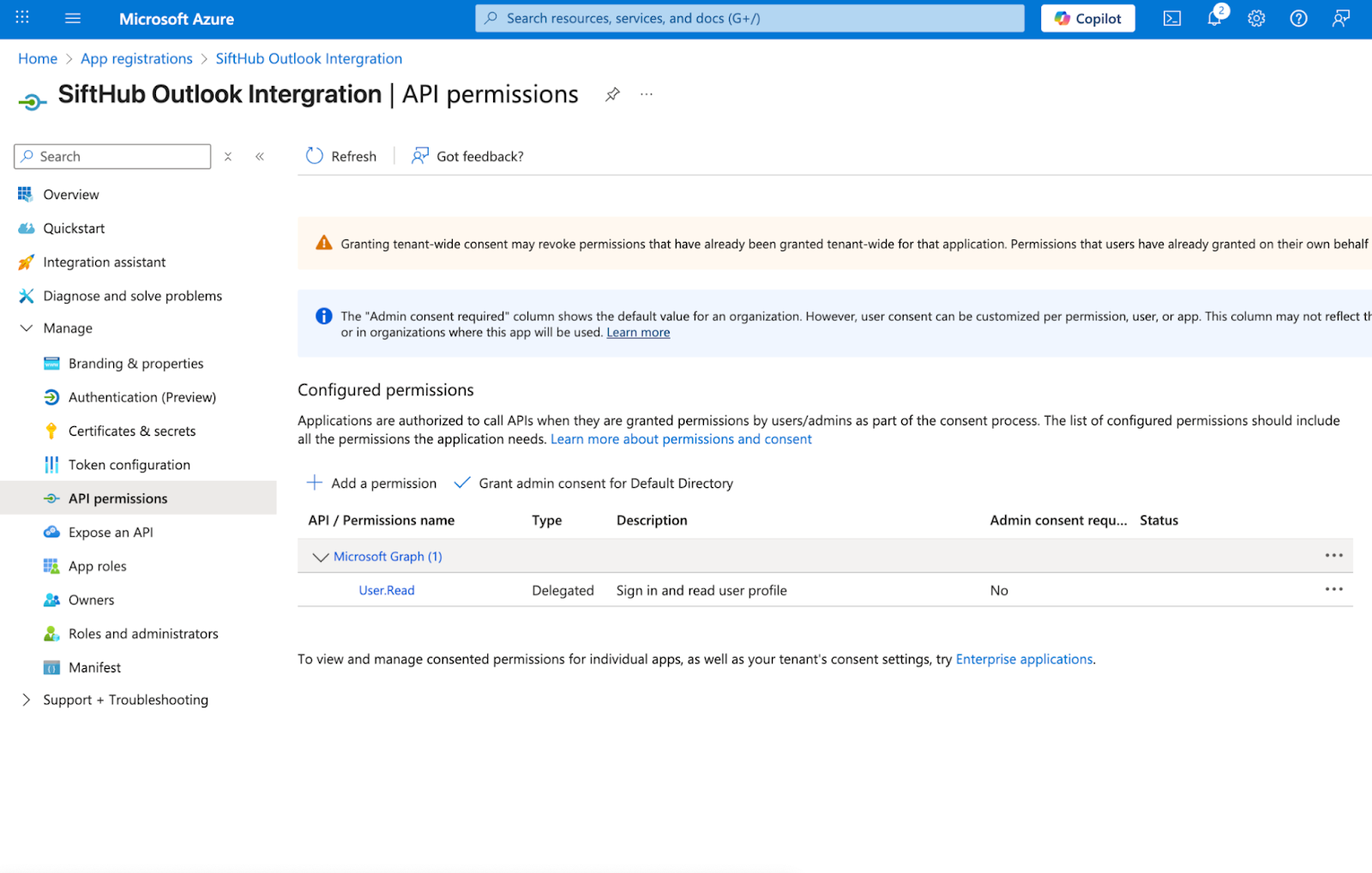 - Grant Admin Consent: Click the Grant admin consent for [Tenant Name] button next to the "Add a permission" button.