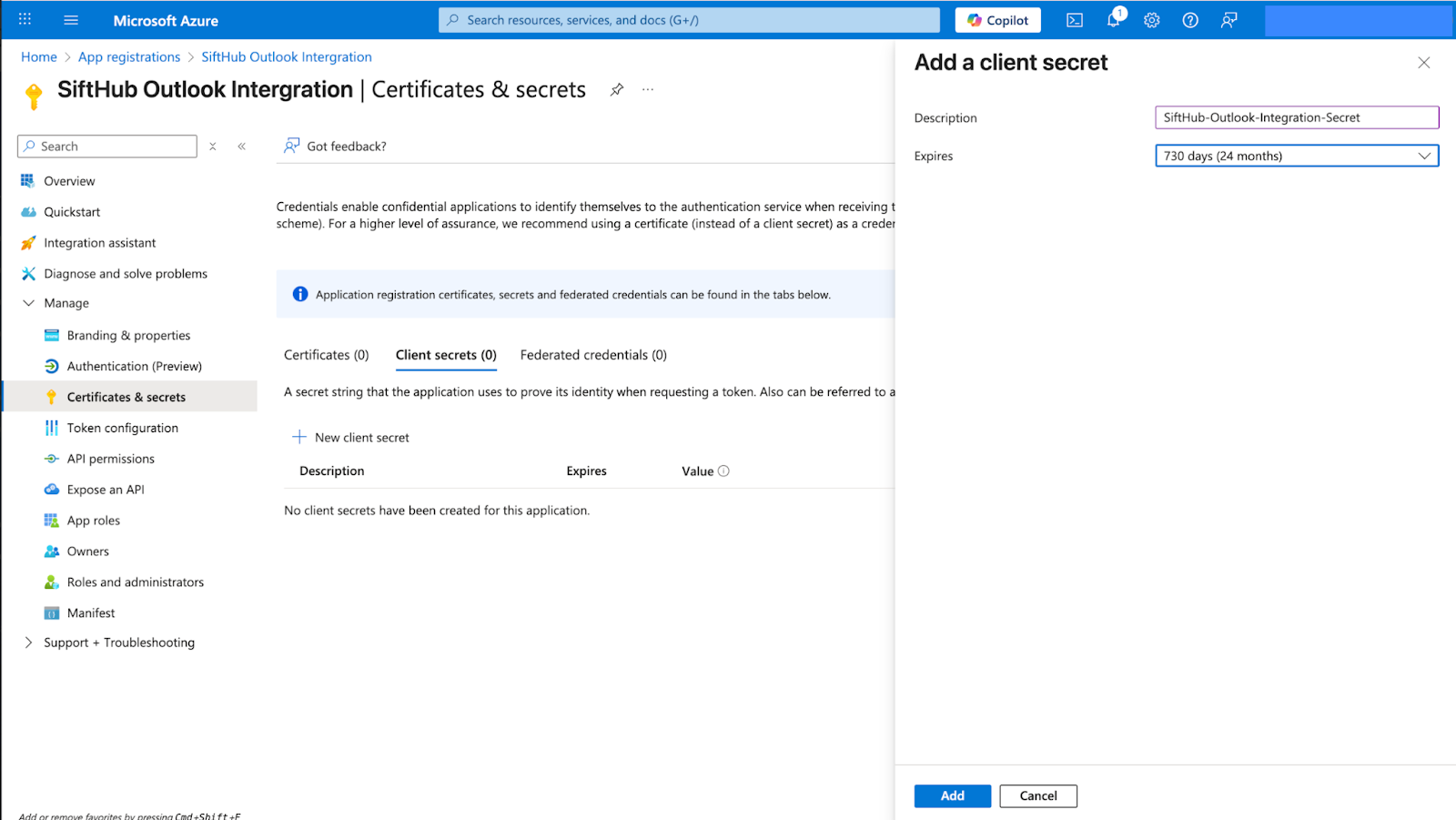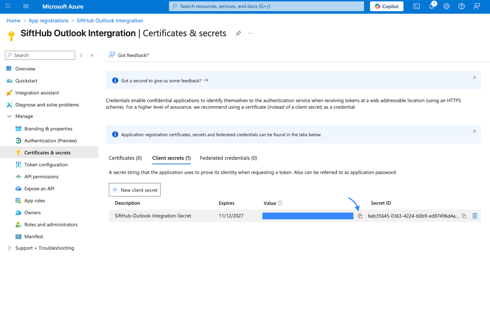 Important: Under Client secrets, copy the Value (not the Secret ID) immediately. This value is hidden after you leave the page. You need to securely share this with your SiftHub Customer Success Manager.