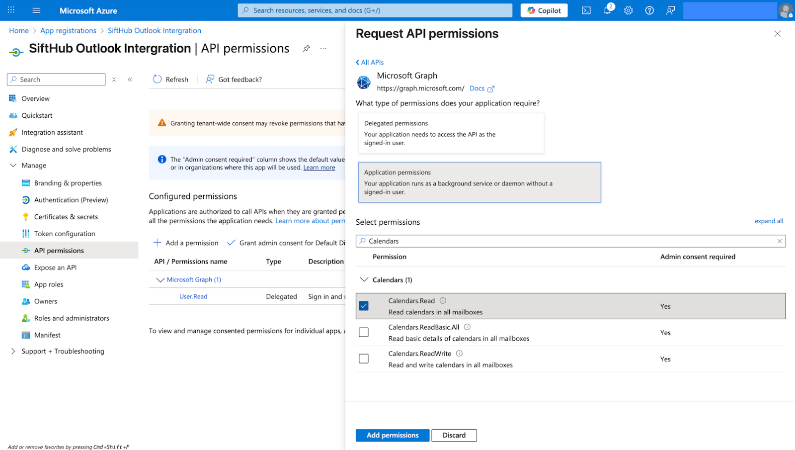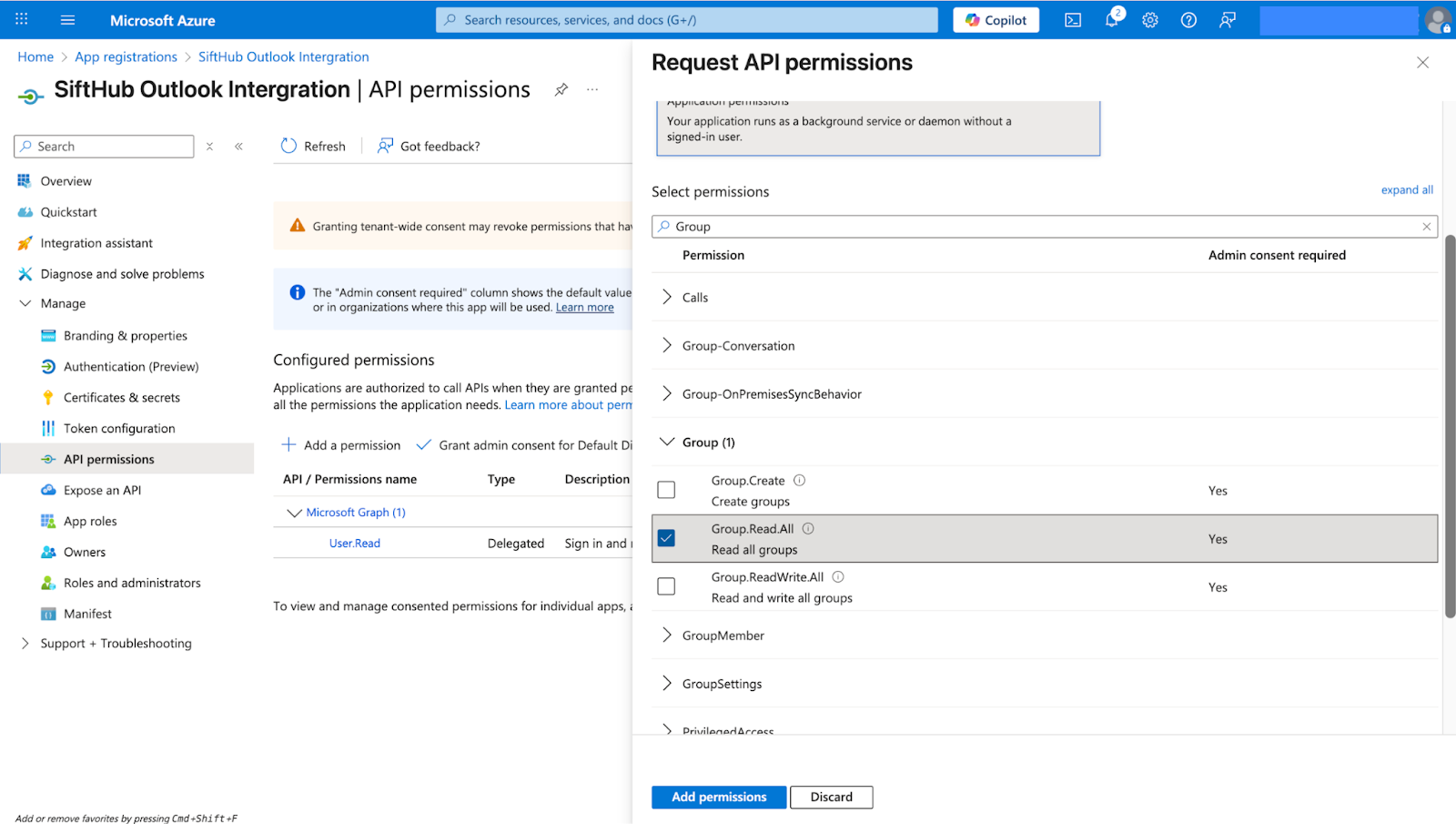 Result: SiftHub now has permission to access calendar data, but only for the members of this Security group.