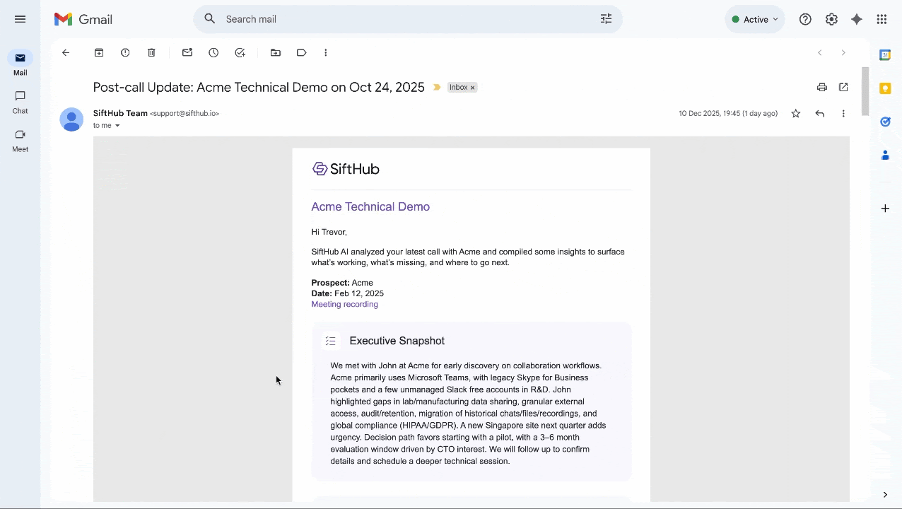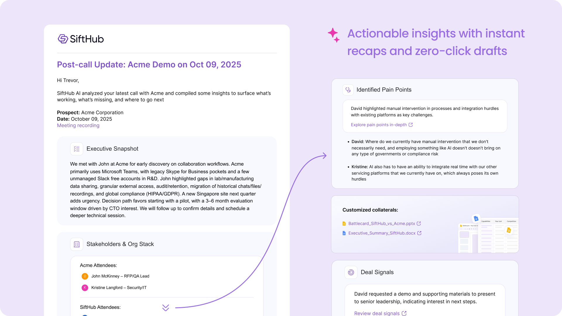 SiftHub automates the bridge between your meeting ending and your follow-up going out. Every section of your post-call update features a Contextual Call-to-Action (CTA) designed to turn insights into revenue-driving action.