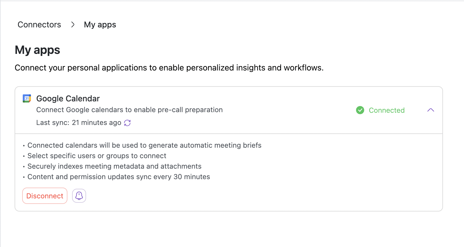 Purpose: Enables personalized workflows, such as using Google Calendar to help prepare for upcoming meetings or summarize daily agendas, while keeping that data private to the user.