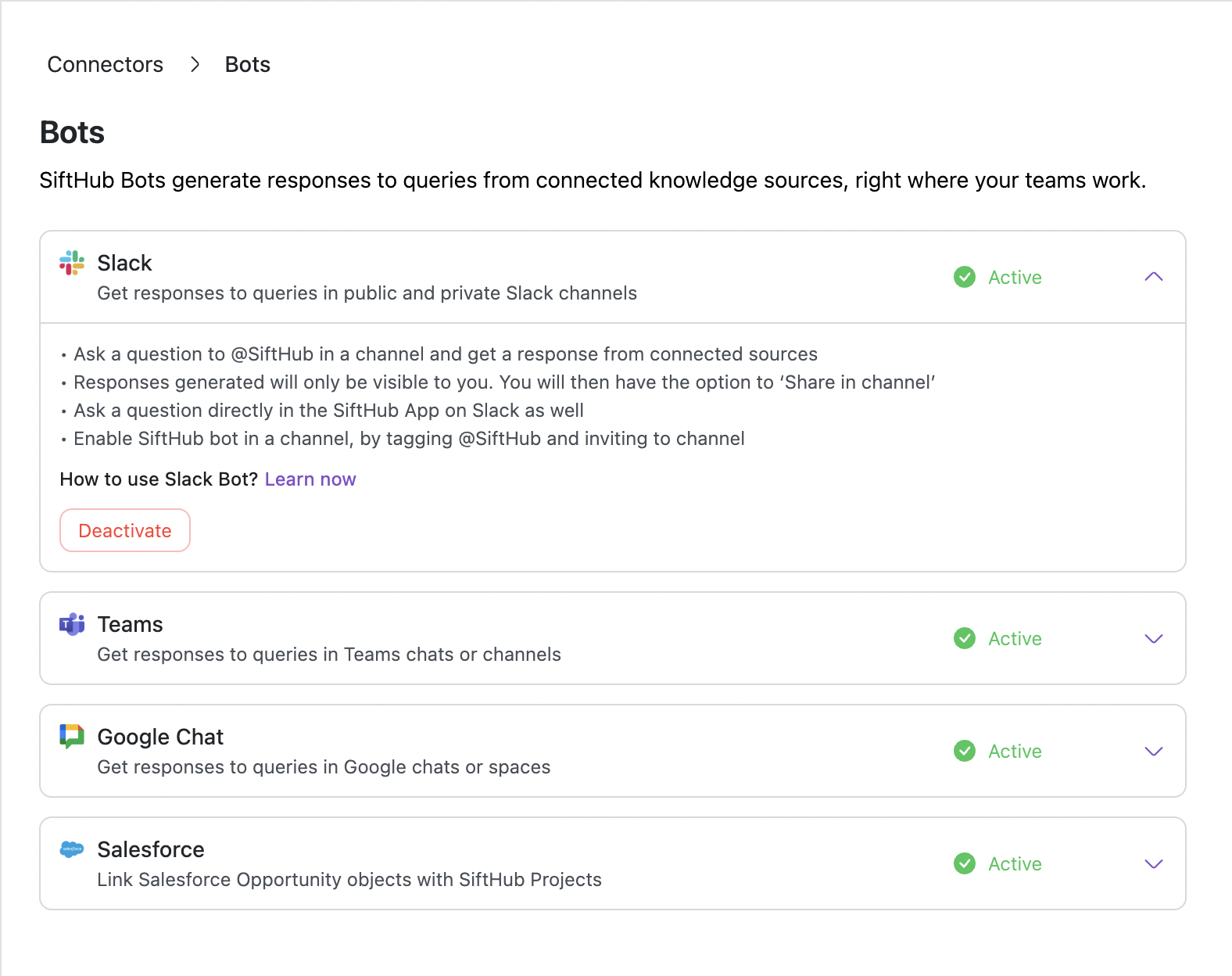 Purpose: To allow teams to get responses or create projects from where they work. For example, to @mention SiftHub in Slack, Microsoft Teams, or Google Chat to get answers or trigger automated project workflows from directly within Salesforce.