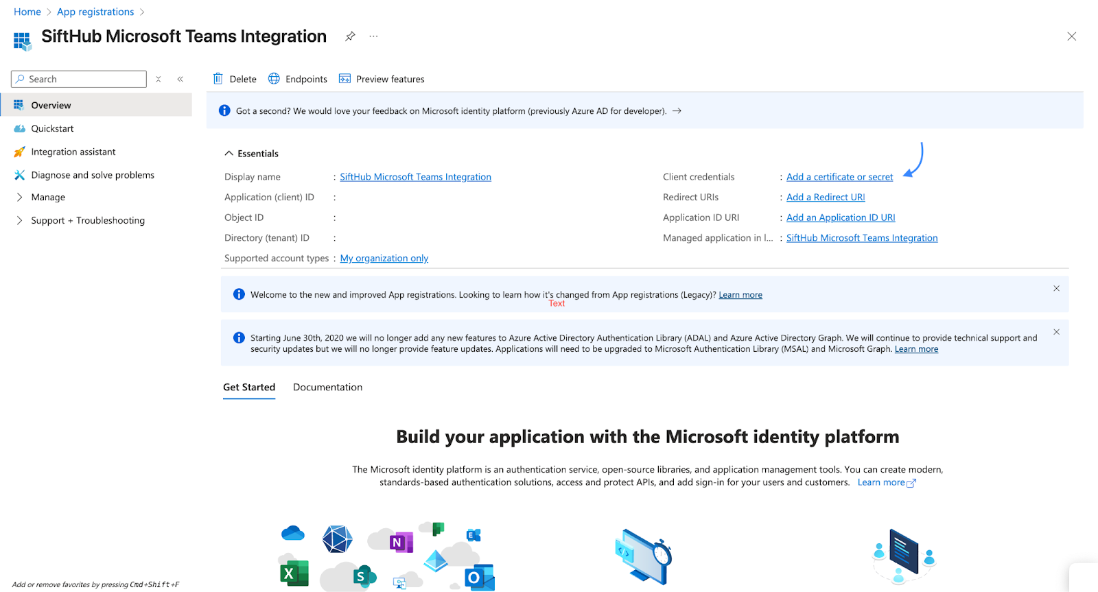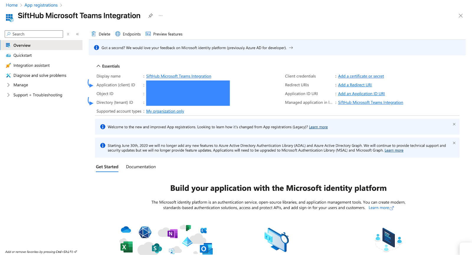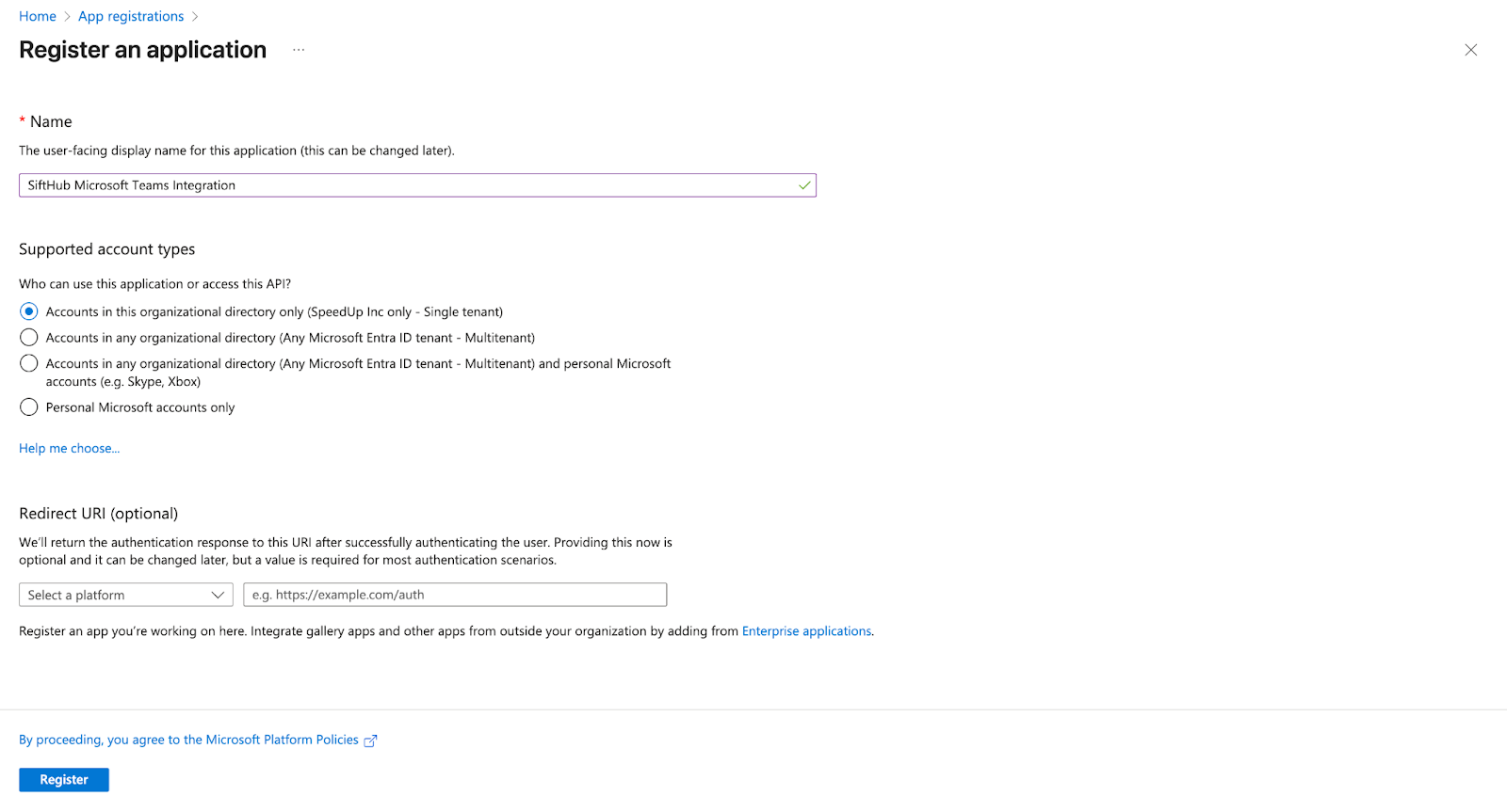 - On the Register an application page, register an app with, Name (eg. SiftHub Microsoft Teams Integration), Supported account type( Accounts in this organizational directory only (Single tenant), Redirect URI(Leave it blank).