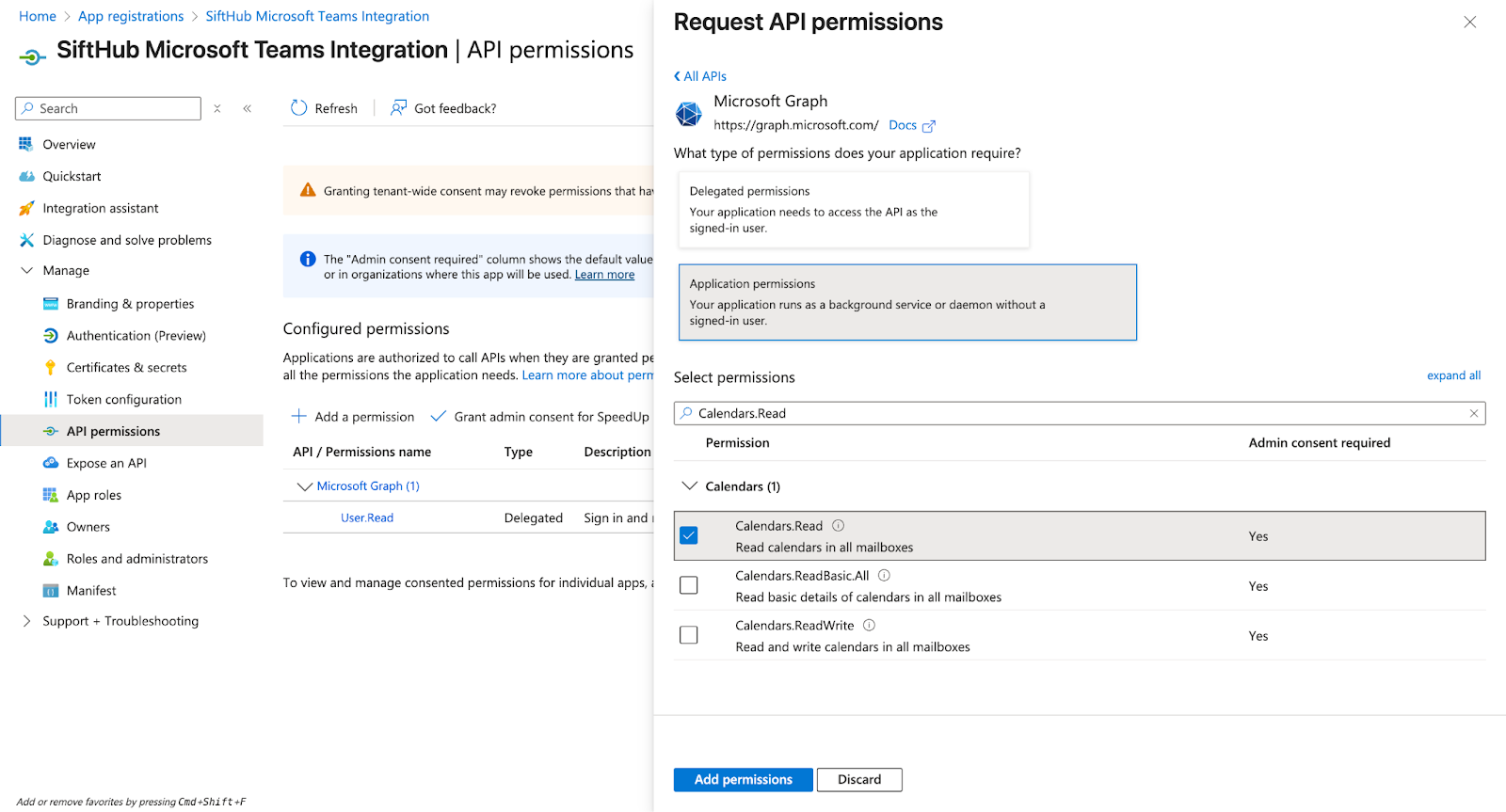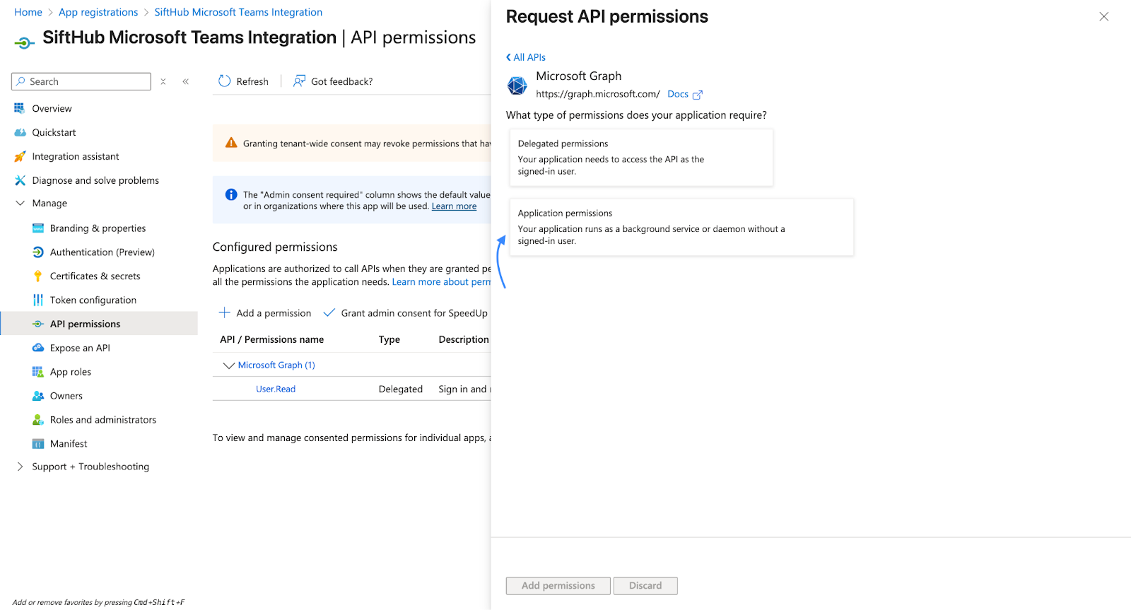 - On the left side navigation on the overview page, select API Permissions -> Add a permission.