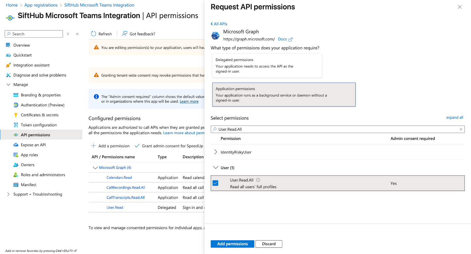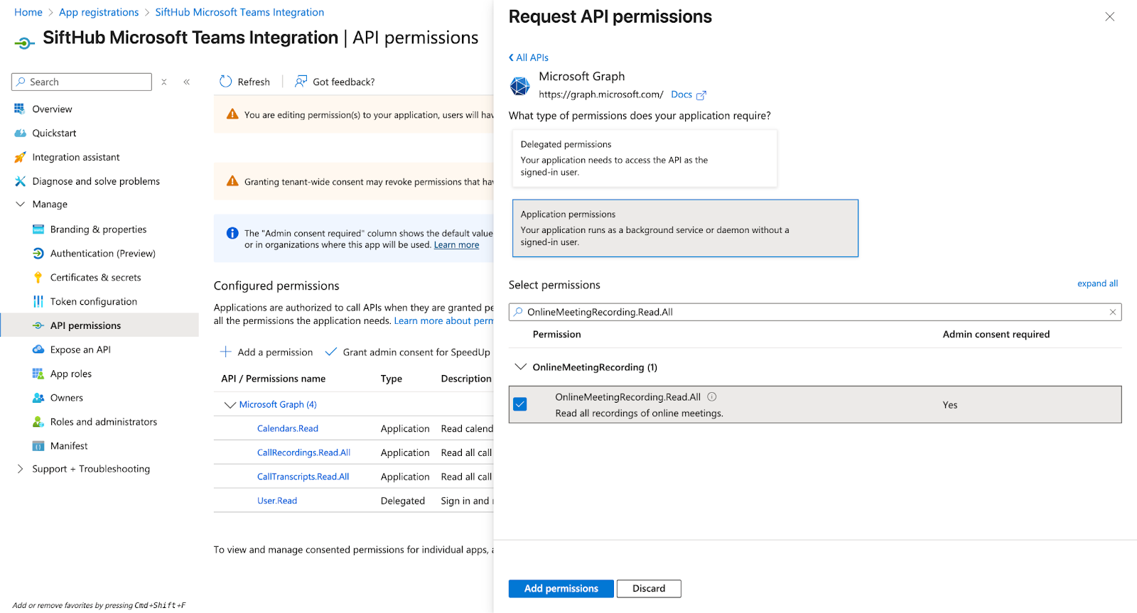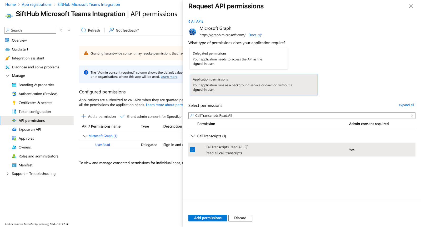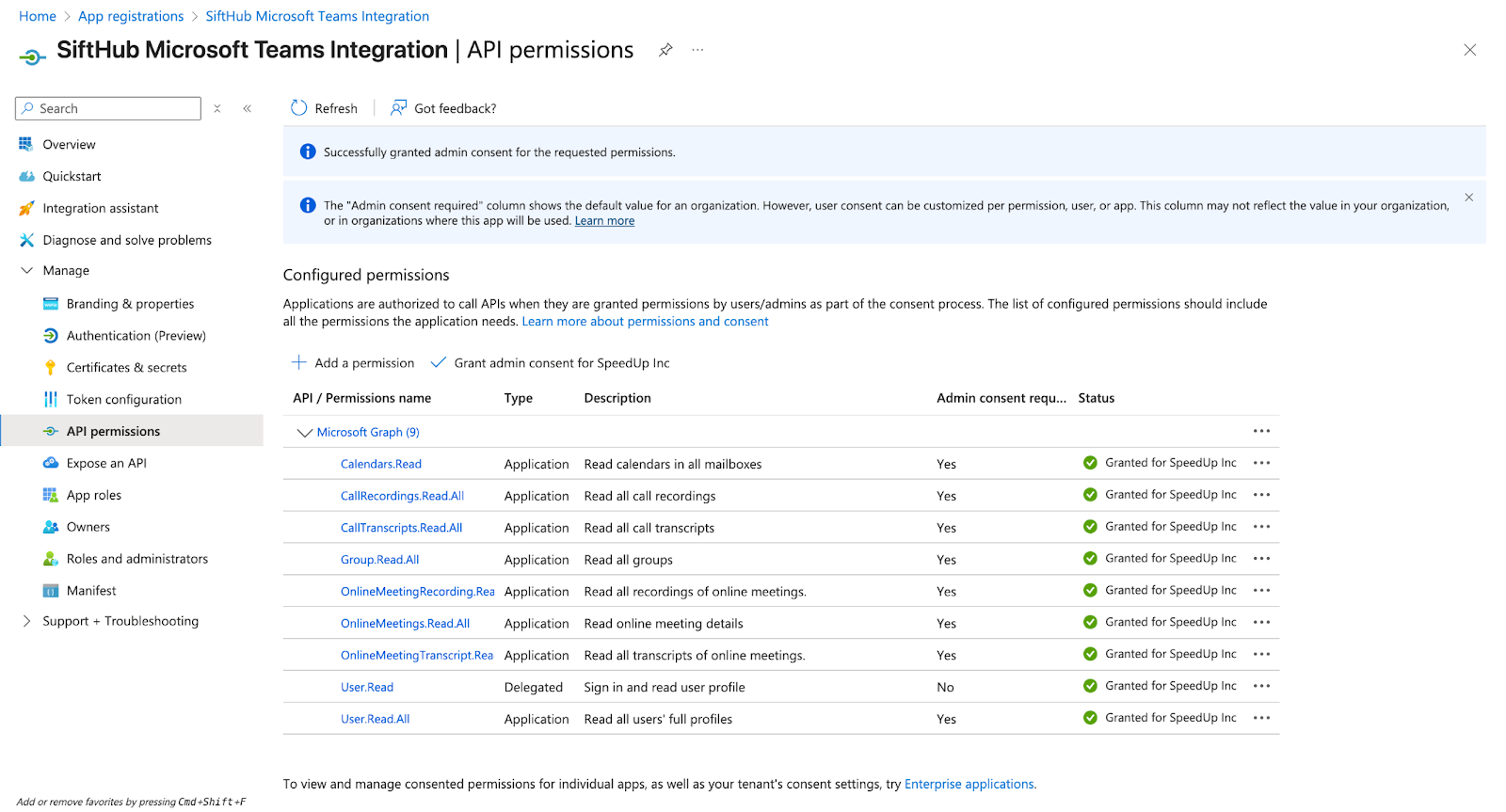 "GlobalTranscriptAccess" -AppIds "<Application-Client-ID>" -Description "Policy to access the transcripts for App"Result: SiftHub now has permission to access call transcripts data