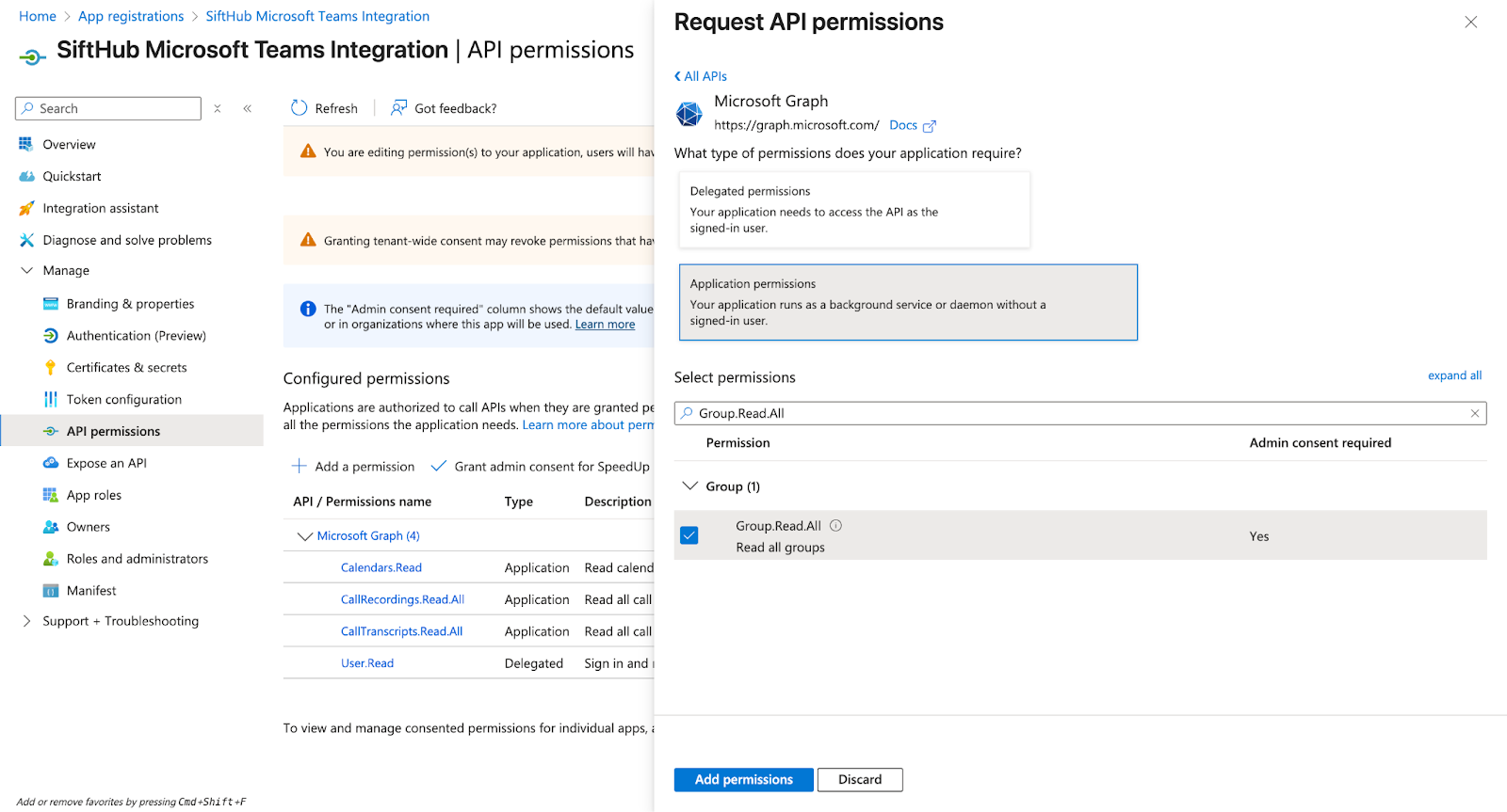 Note: The step mentioned above is the recommended approach. It enables full tenant-wide call ingestion, which is standard for most organizations wanting comprehensive coverage. If you prefer not to grant access to the entire tenant, you can restrict ingestion to a specific subset of users using a Mail-Enabled Security Group. Regardless of the approach you choose, SiftHub will securely index the metadata and attachments. However, with this Restricted Access approach, you get more granular control by explicitly defining exactly which users' call SiftHub is permitted to read, ensuring only the members of your designated security group are indexed.