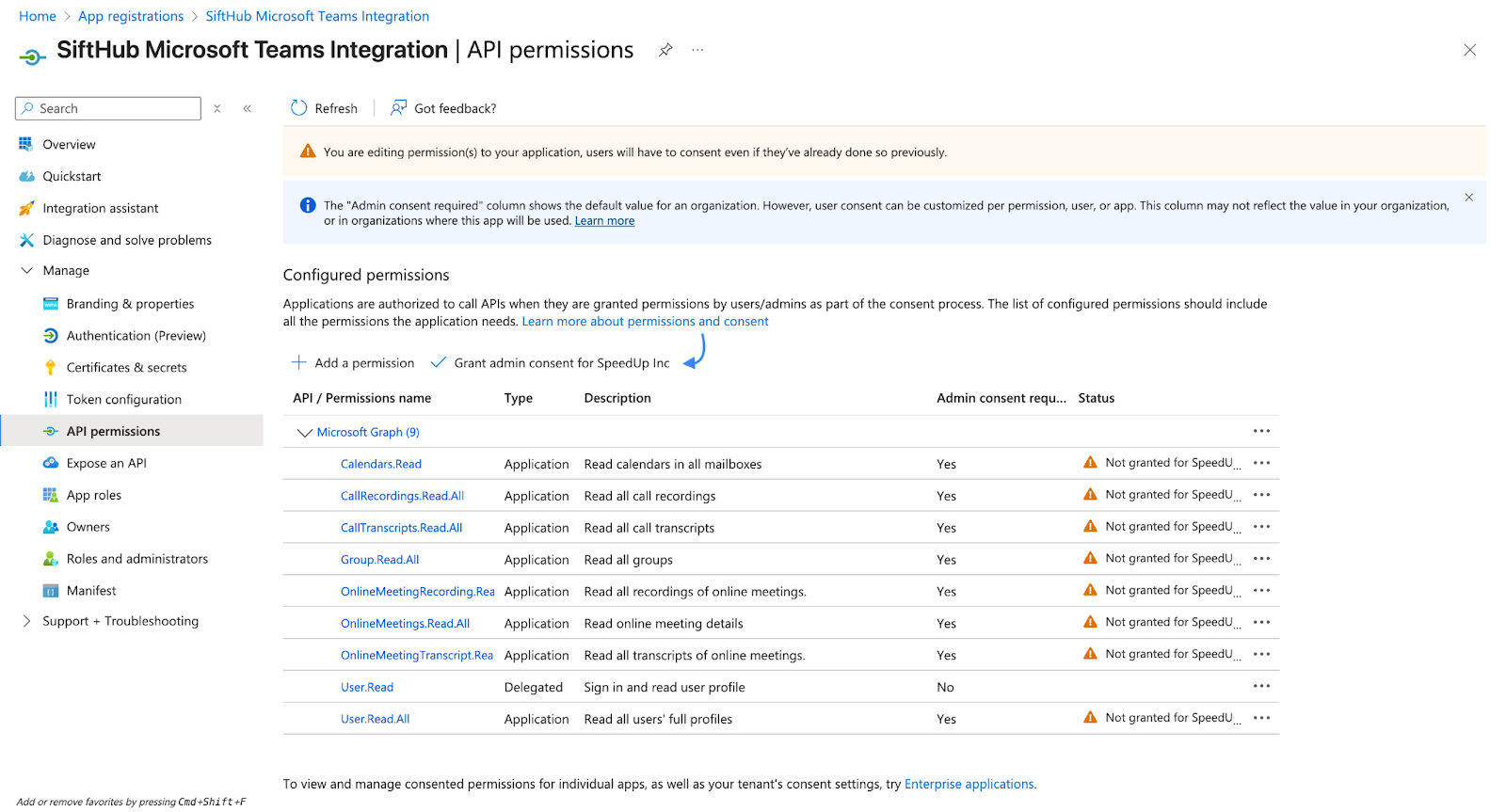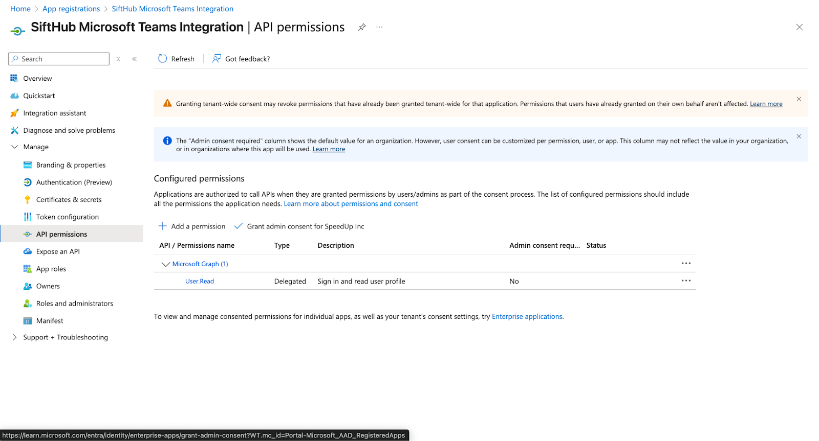 - Grant Admin Consent: Click the Grant admin consent for [Tenant Name] button next to the "Add a permission" button.