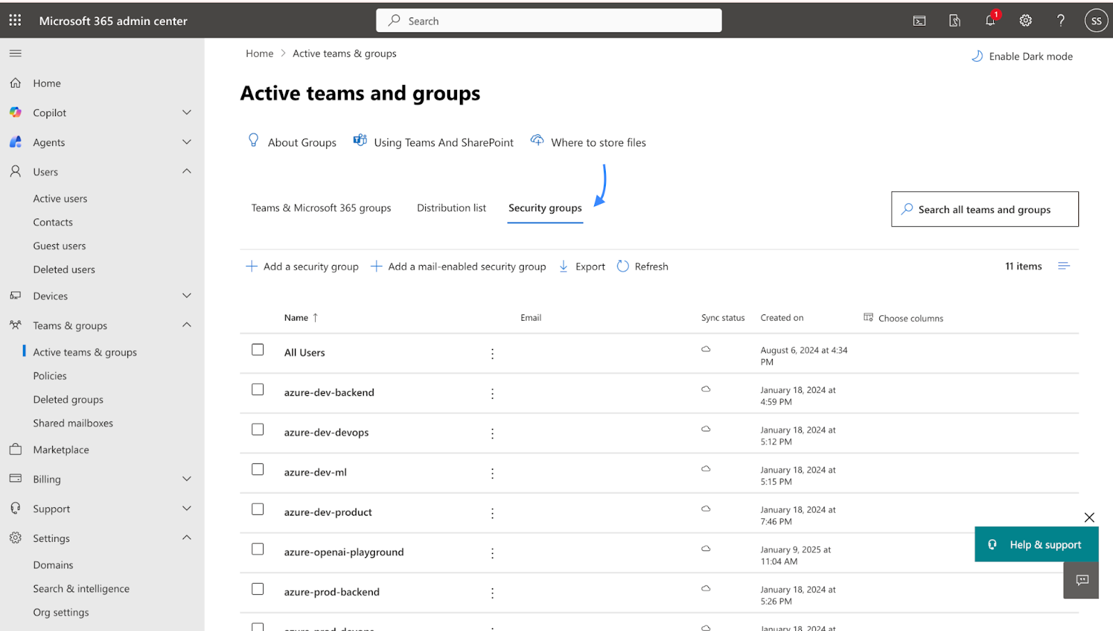 - In the left-hand navigation, go to Teams & groups > Active teams and groups.
