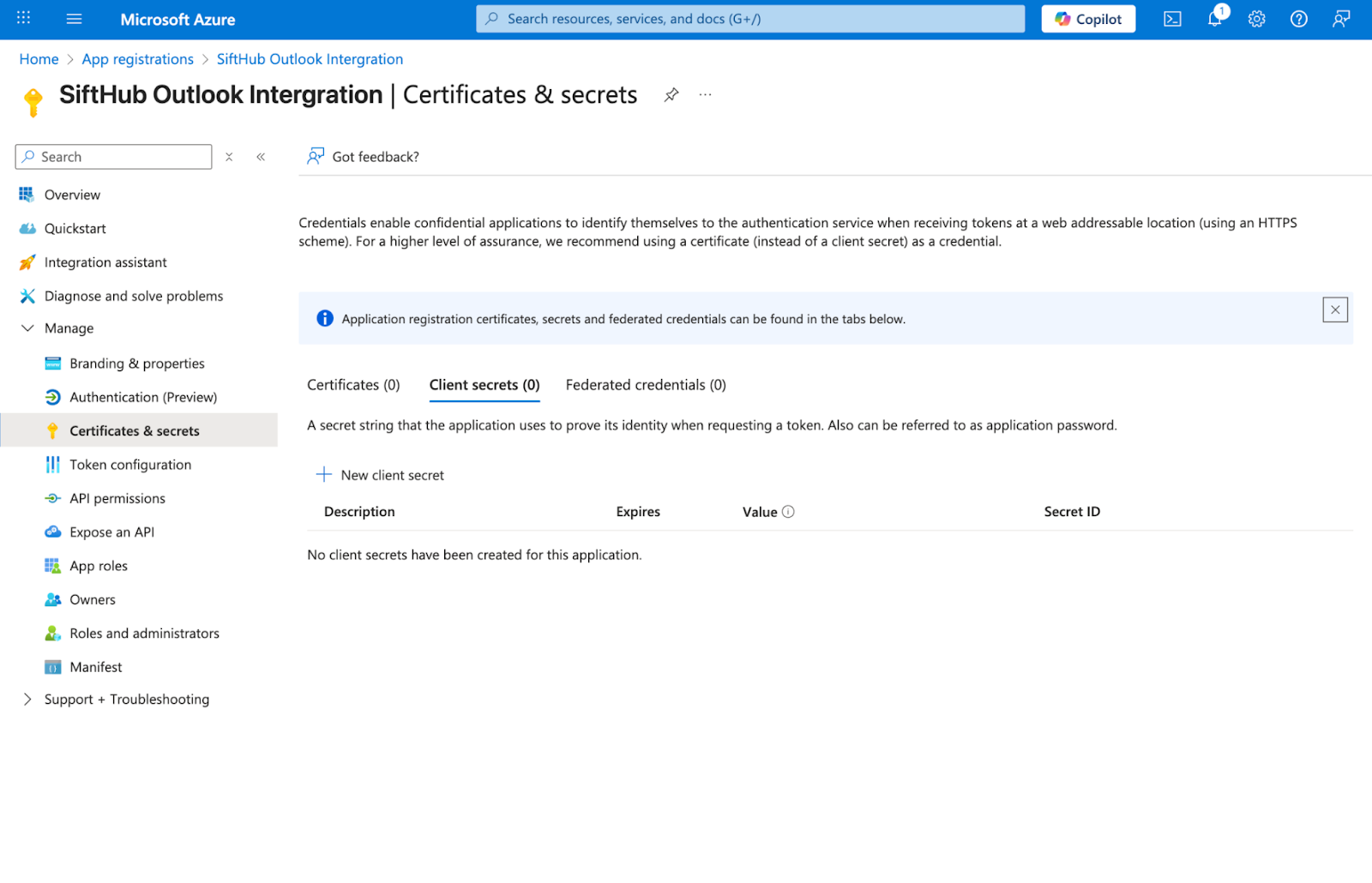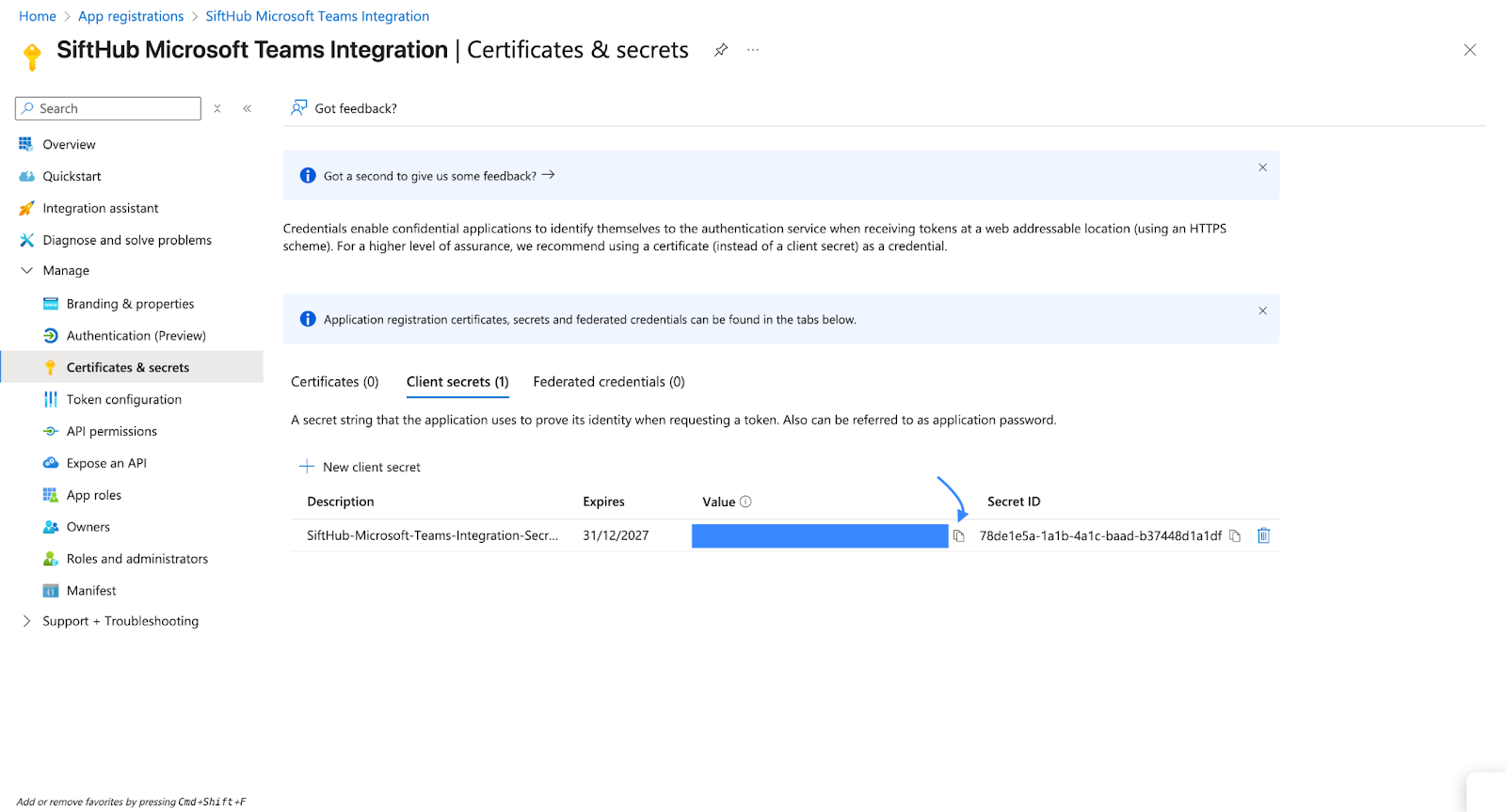 - Important: Under Client secrets, copy the Value (not the Secret ID) immediately. This value is hidden after you leave the page. You need to securely share this with your SiftHub Customer Success Manager.