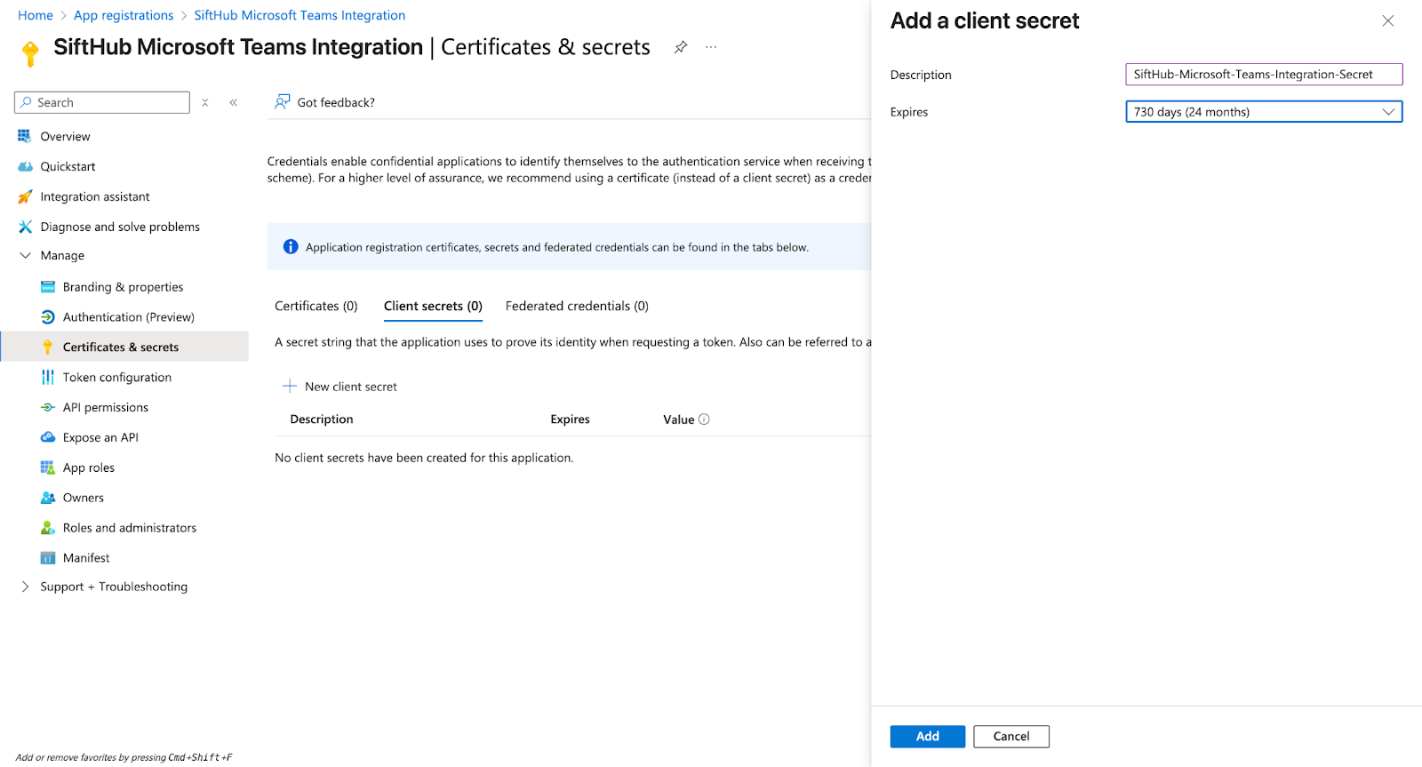 - Enter a description (e.g., "SiftHub-Microsoft-Teams-integration-Secret"). Select Custom in the Expires dropdown and select today’s date for Start and 2 years from today’s date for End. Then, Click Add.