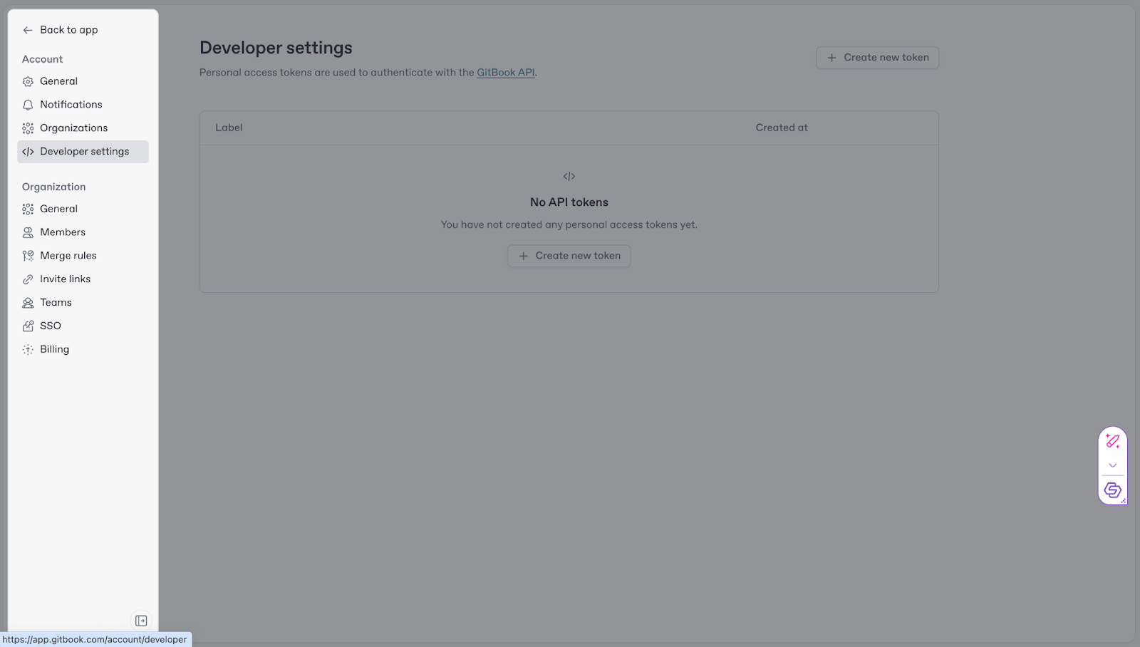 - Navigate to Developer settings. Click on Create new token.