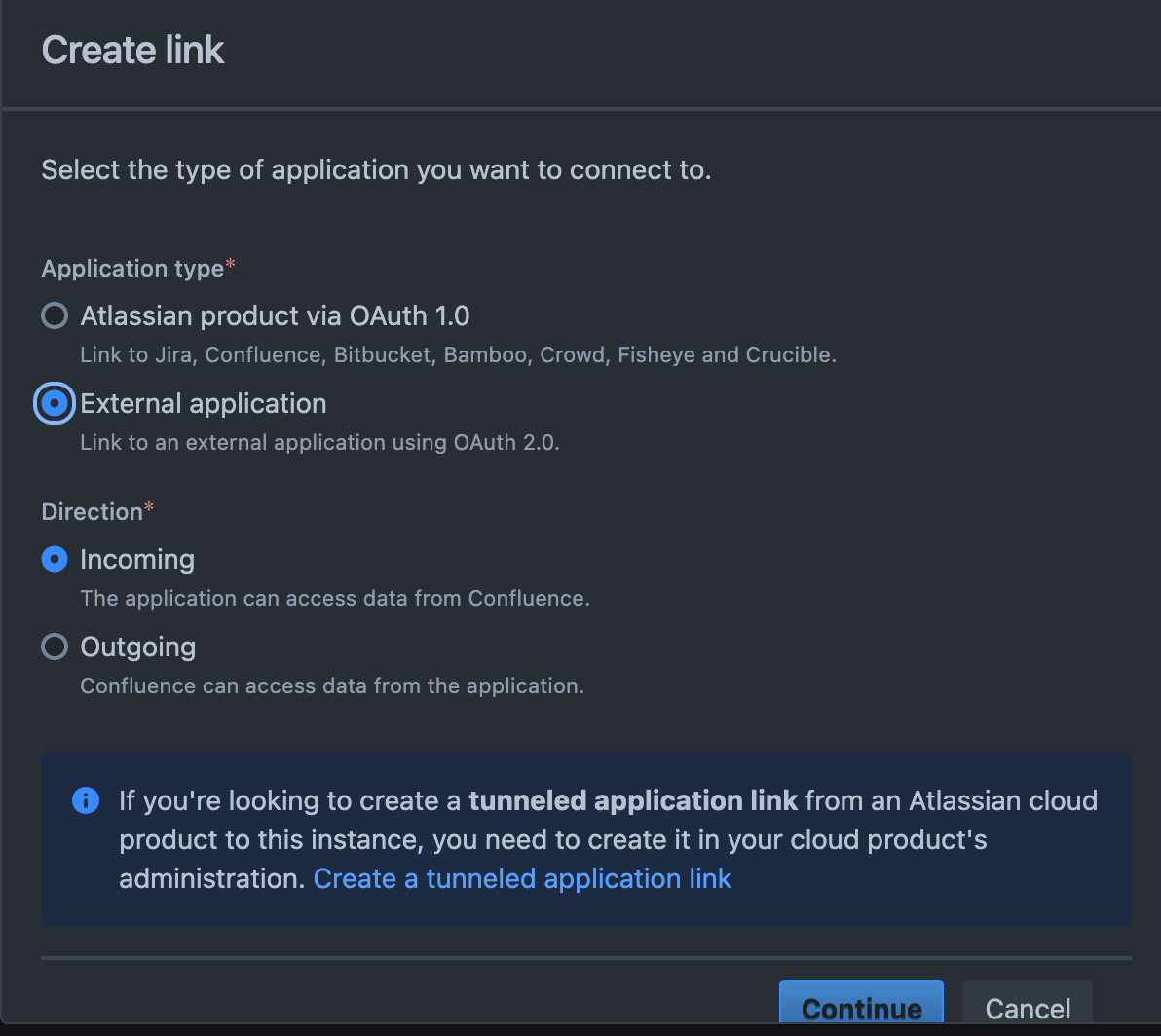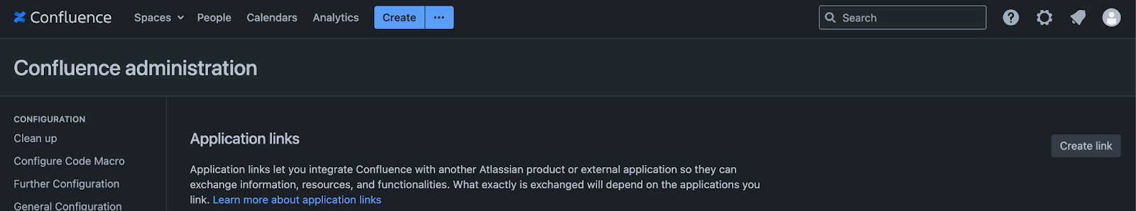 A Confluence application link is required to setup and manage Confluence APIs. This app forms the basis for creating, enabling, and using all the required Confluence identity and access management services.