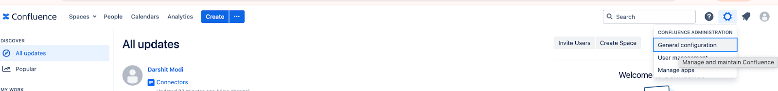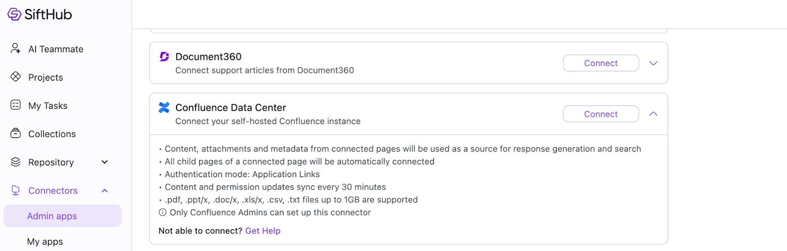 Note: Confluence Administrator access will be required to set up the Confluence Connector for SiftHub. If you’re not the administrator, please contact your Confluence administrator to follow the next steps.