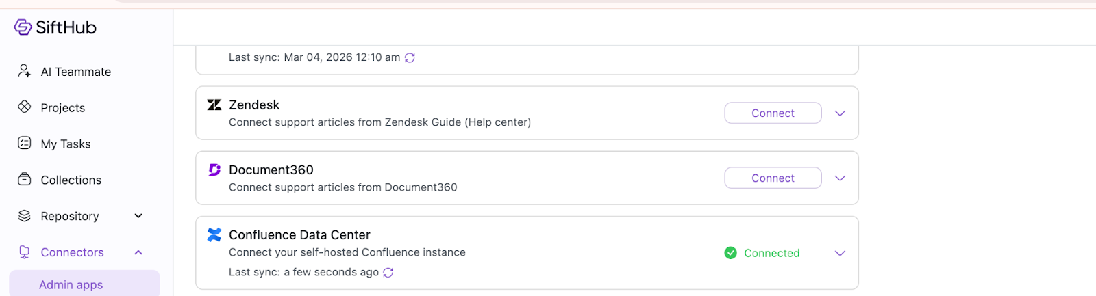 - Go to SiftHub > Connectors > Admin apps in the webapp.