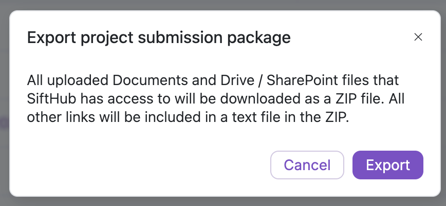 - All uploaded documents and Google Drive / SharePoint files that SiftHub has access to are downloaded as a ZIP file