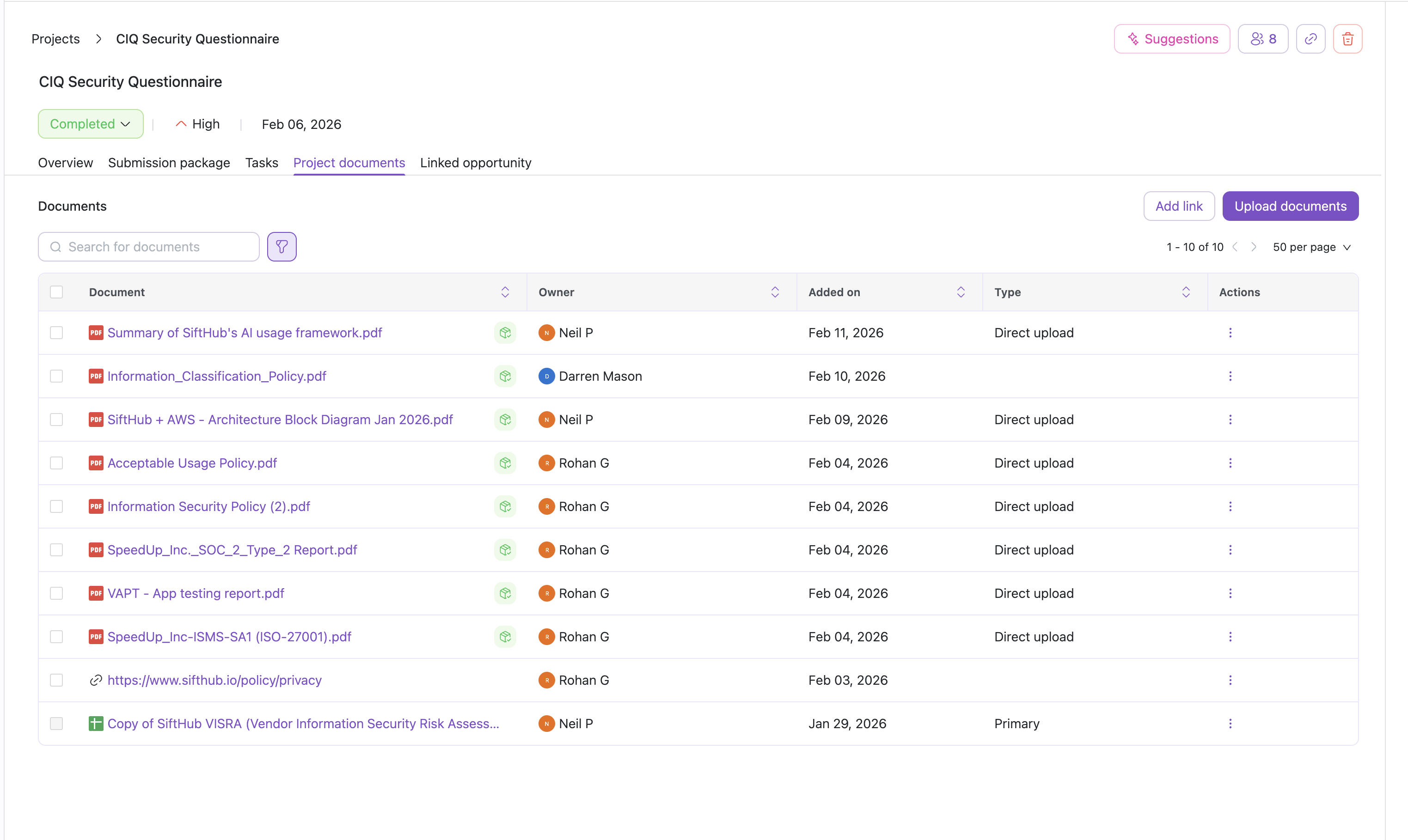 The Project Documents tab provides a centralized view of every document and link associated with your project - from the primary questionnaire to intake documents, task attachments, and submission materials. All project documents are stored here regardless of how they were added.