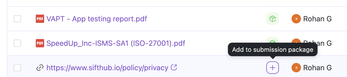 - Purple outlined icon with "+" - document is not in the submission package. Click to add it.