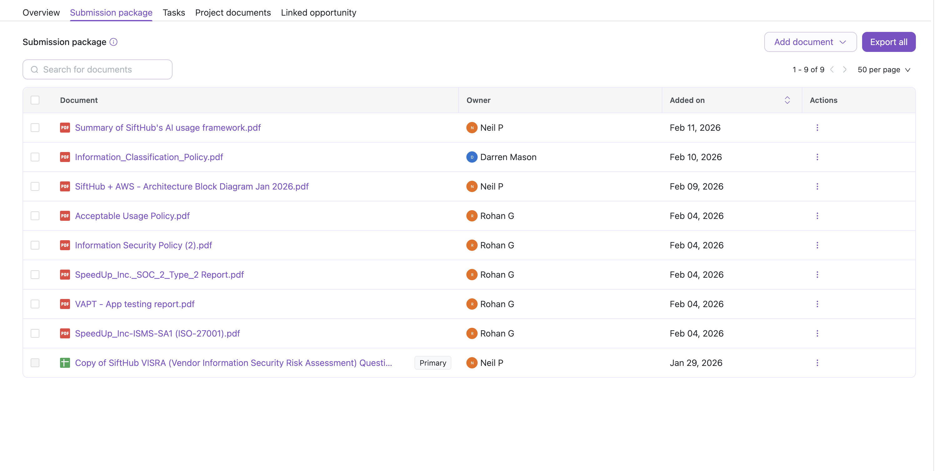 The Submission Package is the curated set of documents and links that form your final project submission. It brings together the primary document, supporting certifications, compliance reports, architecture diagrams, and any other materials required by the prospect - all in one place, ready to export.